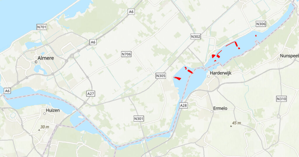 Twee maaiboten zijn actief geweest op het Wolderwijd en het Veluwemeere en elke maaibeweging is nauwkeurig vastgelegd. De breedte van de maaibanen is afgestemd op het maaimes van de betreffende boot. In totaal is er dit seizoen 66 hectare aan waterplanten gemaaid. Hieronder zie je de gemaaide gebieden aangegeven in het rood.